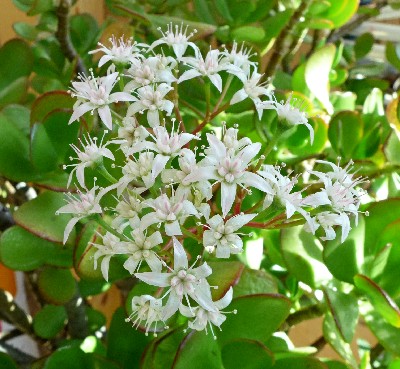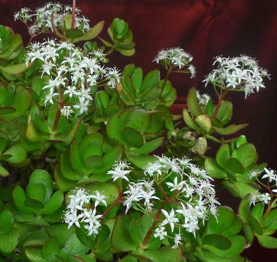 Za oknami teplota začiatkom februára klesá hlboko pod 0°C a nad ránom dosahuje až -10 až -12°C. Na druhej strane v zimnej záhrade je pohodových +12°C. No, keď zasvieti v priebehu dňa slniečko tak sa teplota vyšplhá aj na 25 - 27°C. Táto teplota spolu s dostatočným osvetlením vytvára priaznivé podmienky pre Crassulu ovata aby krásne zakvitla. Takto zakvitla Crassula ovata v mojej zbierke. Má 10 rokov, výška 60 cm, priemer koruny 55 cm, priemer kmeňa nad substrátom 7,5 cm.